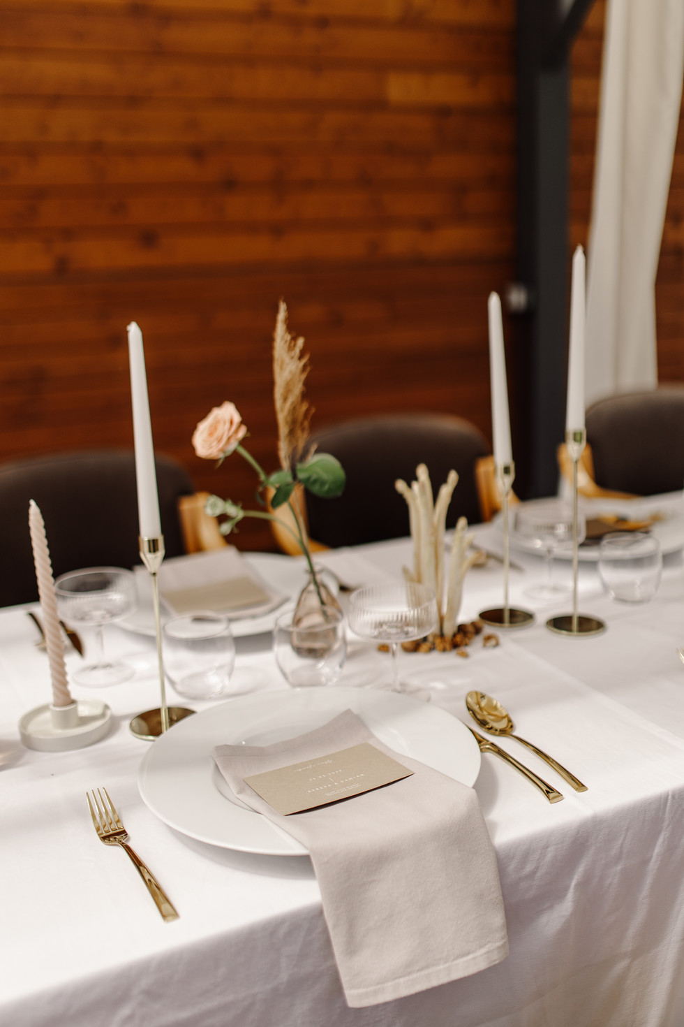 Tiskoviny, navržené grafičkou Anetkou, skutečně září svou jednoduchostí. Zadání bylo jasné: černá, tmavě hnědá, svěží hořčicová a krémová, s několika prvky zvířat. Anetka odvedla naprosto skvělou práci! Jak můžete vidět, vše k sobě dokonale ladí a nic neruší. Její práci miluji, protože pokaždé přináší něco mimořádného! Chtěla bych zdůraznit jednoduchost těchto tiskovin. Dbala jsem na to, aby všechny prvky mezi sebou harmonicky souzněly, což se nám podařilo propojením s malým pampasem, který najdete v květinové výzdobě. Tiskoviny samozřejmě nechyběly ani na stolní dekoraci.